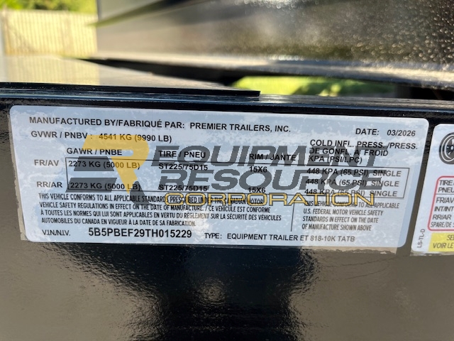 Description: NEW, 10,000 lbs. GVW, 18′ total deck length, heavy duty ramps, diamond plate fenders, stake pockets & side rails, storage area for chains, pressure treated decking, adjustable 2 5/16 hitch, LED lights, includes spare tire